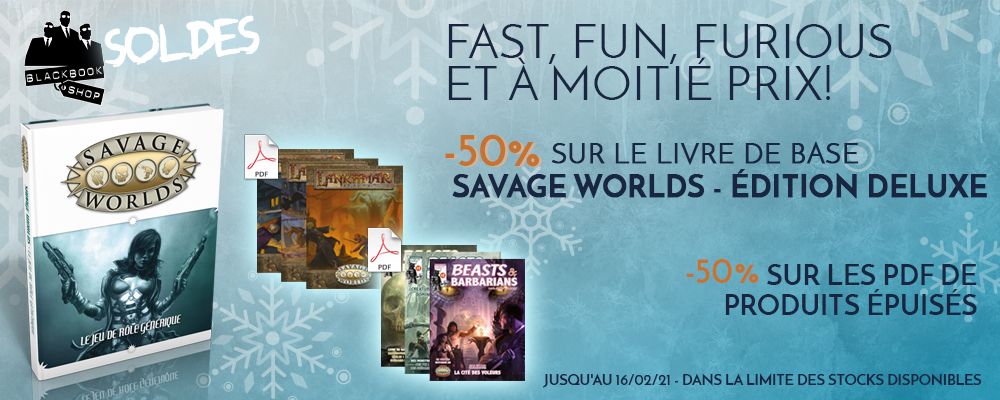 Vous avez bien lu. Tous, absolument tous les produits physiques & PDF de la gamme sont à moitié prix, voire moins, pendant la durée des soldes. Boîte d'initiation Rôle 'N Play, livres de règles, écran, bestiaire, cadre de campagne, cartes de sorts, dossiers de personnages, accessoires et même artbooks... eh oui, c'est razzia. Tout est là.