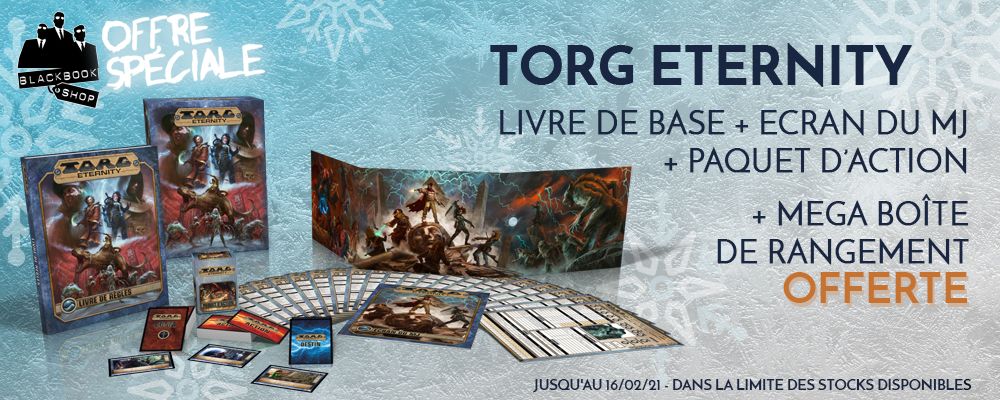 À l'occasion des soldes, nous lançons une offre spéciale : découvrez le formidable monde hybride de Torg Eternity en choisissant le lot Livre de base + Ecran du MJ + Paquet de Cartes d'action + la volumineuse et très solide méga-boîte de rangement (valeur : 20 €) offerte !