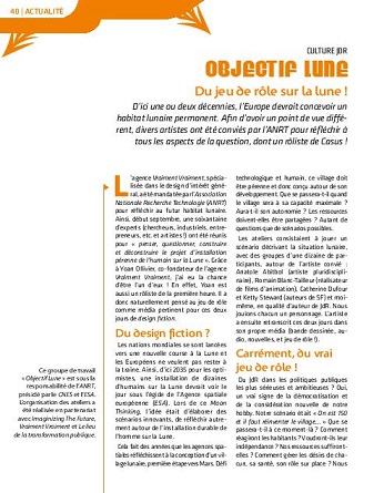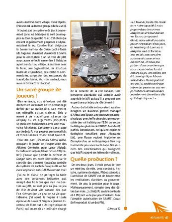 Il est temps de vous parler de notre preview. Janvier 2020, on a reçu un mail un peu fou à la Rédaction. Un certain Yoann Ollivier, un chercheur en politiques publiques qui bosse sur… un village lunaire international. Oui oui, sur la lune. Le plus sérieusement du monde. L’Europe, prise dans les tensions entre les géants américain et chinois, cherche à travailler sur sa position de négociation. Et quel meilleur outil pour le faire que… le jeu de rôle. Le nôtre, le JdR, avec fiches de perso et compagnie ! Car Yoann est rôliste et lecteur de Casus. Et il cherche des auteurs pour mener à bien son expérience.