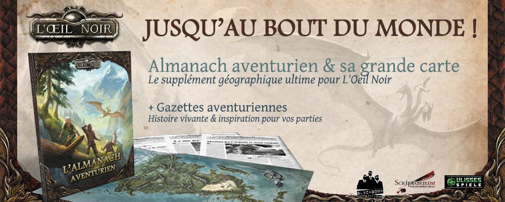 Arrêtez de vous frotter le z'oeil, déjà que vous en avez qu'un et qu'il est tout noir... vous avez bien lu : l'Almanach aventurien, très attendu par les fans de L'Oeil Noir, arrive tout chaud de l'atelier de nos amis de chez Scriptarium après moultes relectures attentives.