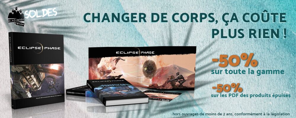 Alors que son tout nouveau supplément Firewall est en précommande (PDF offert), on vous offre l'occasion de découvrir toute la superbe gamme de SF sur la transhumanité Eclipse Phase, à moitié prix ! Attention, certaines références ne sont plus disponibles qu'en toutes petites quantités, c'est sans doute la dernière chance de mettre la main dessus !