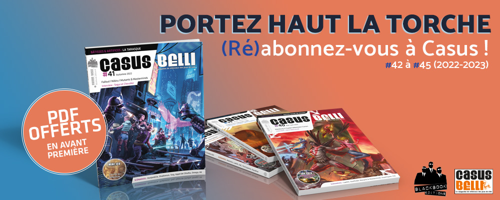 Alors que le numéro #40 du magazine Casus Belli est disponible dans toutes les bonnes boutiques, le PDF du #41 est d'ores et déjà disponible en PDF pour les abonnés : départ à l'impression imminent pour une sortie au début de l'automne, conformément à la nouvelle périodicité du mag qui devient officiellement trimestriel. Vous aurez dès la semaine prochaine la possibilité de vous (ré)abonner pour les 4 prochains numéros (42 à 45).