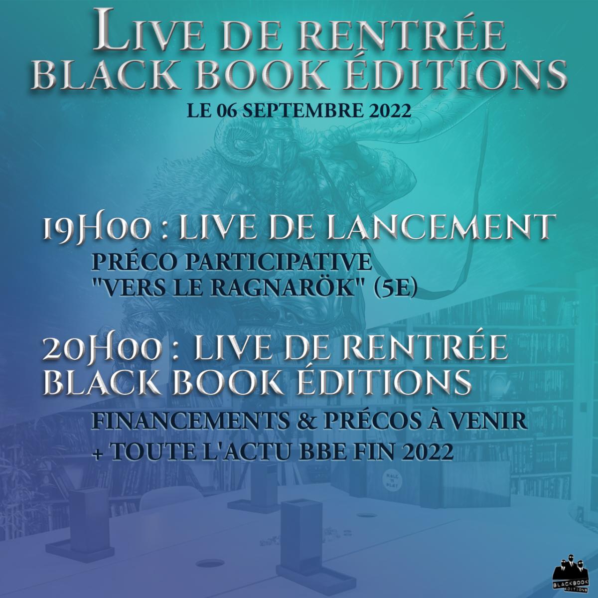 - 20h00 : live de rentrée avec Tony, Marc et Laura : venez découvrir toute l'actu brûlante de Black Book Editions et de Rôle'n Play jusqu'à la fin de l'année 2022 : les précommandes participatives et les précos classiques prévues d'ici la fin de l'année (accrochez-vous, on va vous en révéler une belle !), les sorties de nouveautés prévues à temps pour les fêtes, l'actualité du Black Book Shop (avec une belle annonce pour tous les gens de la métropole de Lyon !), les surprises à attendre du nouveau financement de Rôle'n Play, et plus encore !