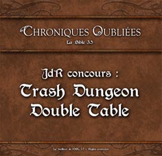 - Découverte : Toute la journée, vous pourrez tester sur notre stand - en exclusivité et en avant-première - la création de personnage pour Chroniques Oubliées, la bible 3.5 utilisant nos règles maison. Une fois votre personnage créé, vous pourrez aussi vous inscrire au grand concours Trash Dungeon Double Table.
