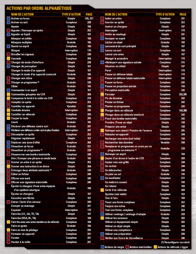 Pour vous donner un aperçu du côté pratique de ces aides de jeu, nous vous invitons à télécharger en cliquant ici une des feuilles recto-verso en preview. Il s'agit de la feuille des actions qui donne d'un côté la liste des... actions (avec renvois de page) par thèmes (matrice, magie, combat et rigger) et par type d'action (gratuite, simple, complexe, etc.). Et de l'autre, toutes les actions, par ordre alphabétique (pratique !), avec renvois de page bien sûr et même des indices de couleur pour visualiser immédiatement le thème de l'action (matrice, magie, etc.).