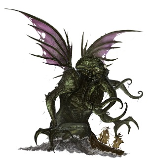 Les entités cosmiques antédiluviennes font donc partie de Golarion, tapies dans le vide qui sépare les étoiles connu sous le nom de la Sombre Tapisserie. Nous ne vous révèlerons pas aujourd'hui la liste des quelques grands anciens se trouvant dans le Bestiaire 4. Il était pourtant délicat de cacher la présence du plus célèbre d'entre tous : CTHULHU !