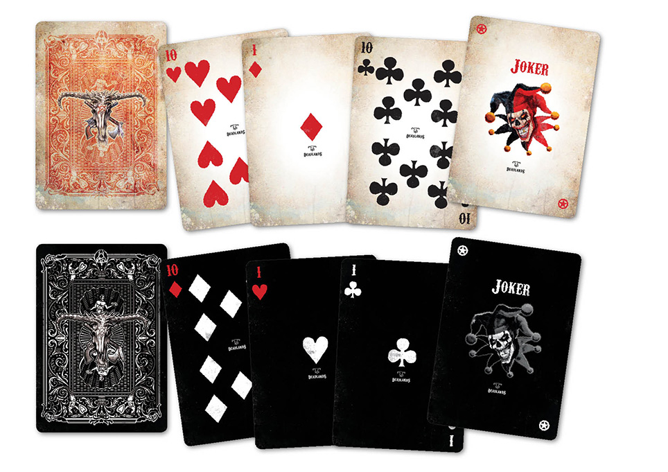 Quoi de neuf du côté du crowdfunding Deadlands ? Le travail continue pour peaufiner les derniers textes du bestiaire bonus débloqués (stats, relecture ortho). Parmis les nombreux add-on offerts grâce au financement participatif, nous vous avions montré par le passé le design des cartes d'Aventure (une sorte de jeu de cartes pour introduitre du narrativiste dans vos parties en quelque sorte ; voir l'image ci-contre) et il ne nous restait donc plus qu'à vous montrer les designs des deux jeux de cartes de poker (le blanc et le noir).