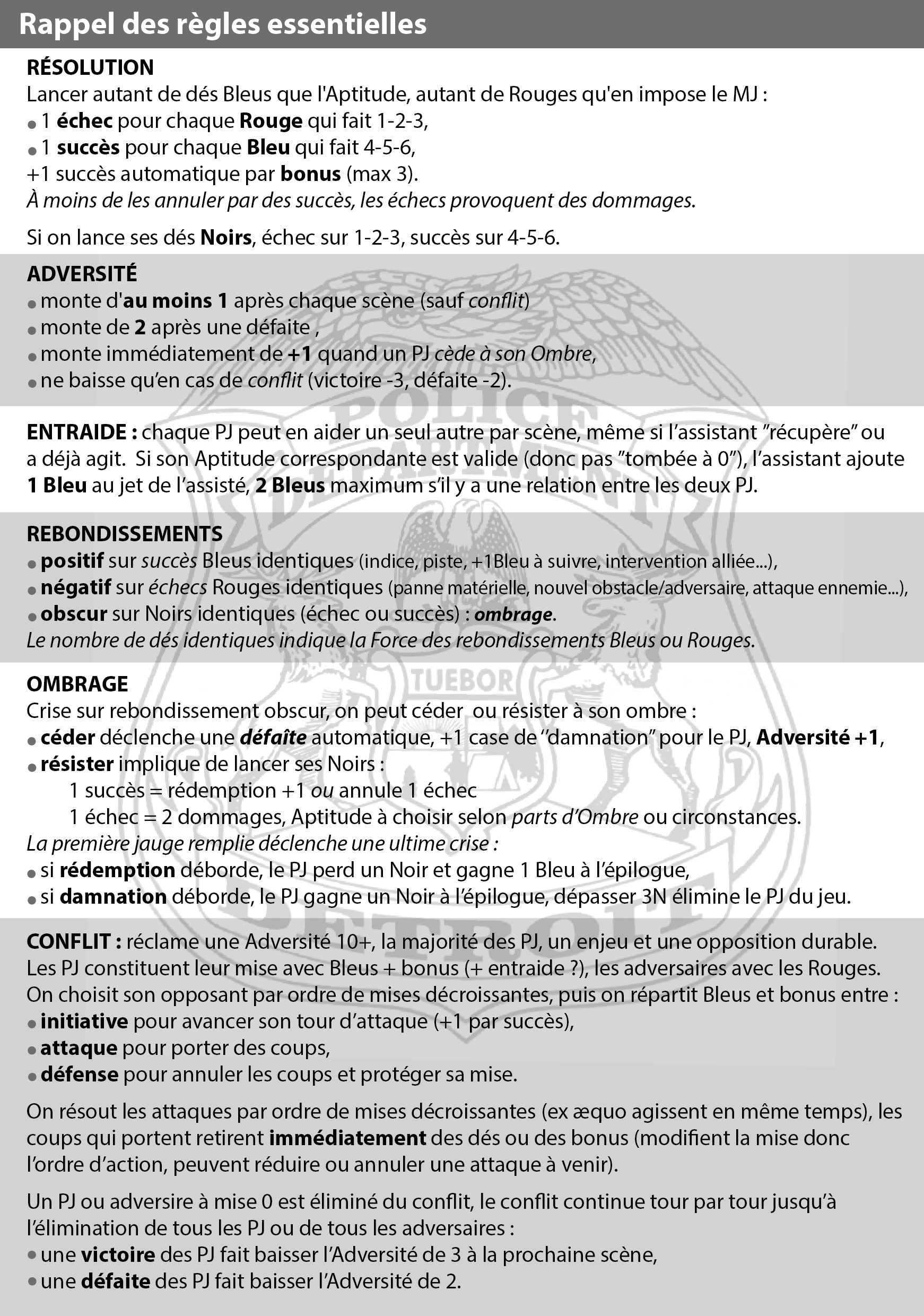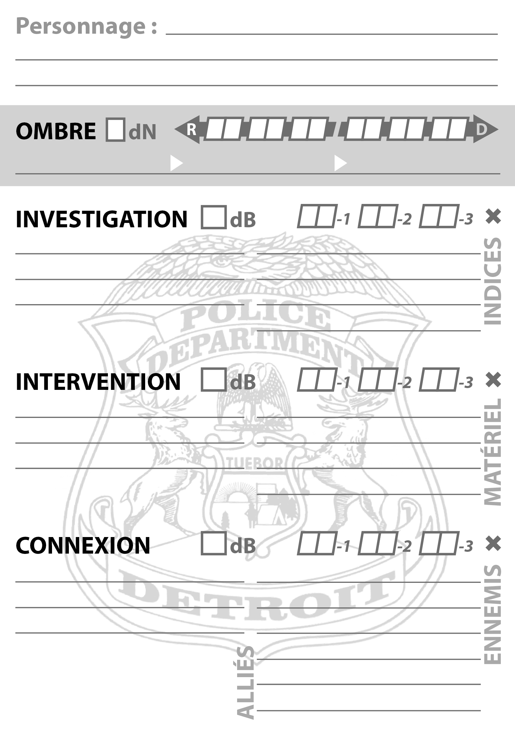 Le système Ombrage est conçu pour motoriser des investigations dans un contexte sombre et hostile, en l'occurrence le Détroit moderne en cours d'effondrement (voir CB#13). Mais au-delà des révélations et des rebondissements qui animent d'ordinaire les scénarios d'enquête, ce système met l'accent sur les protagonistes (PJ) et leur « part d'Ombre » : les vices, les pulsions et les compromissions qui les guettent. Dans ce jeu, les personnages n'affrontent pas que les mystères ou la violence autour d'eux, mais aussi les forces obscures qui les animent, et qui les hantent.