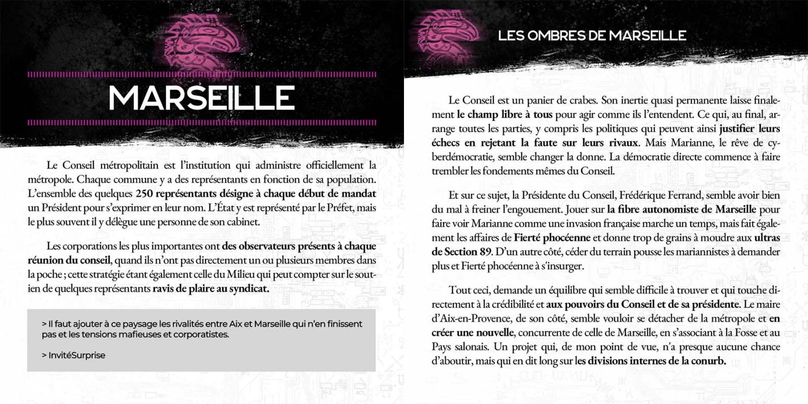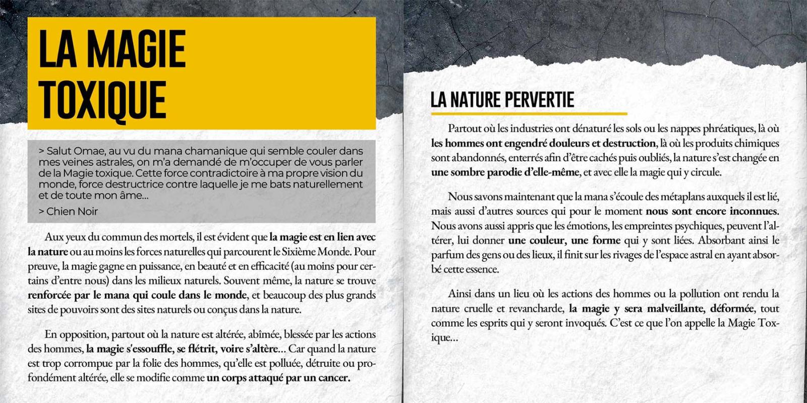 Voici des previews exclusives pour les 2 suppléments Shadowrun qui seront disponibles dans la précommande participative. On vous offre donc un aperçu de la magie toxique, disponible dans Anarchistes, le supplément Shadowrun Anarchy ainsi qu'un texte concernant le background du Marseille de 2080 que vous pourrez retrouver dans La France des Ombres, le supplément Shadowrun 6 exclusif à la version française de la gamme !