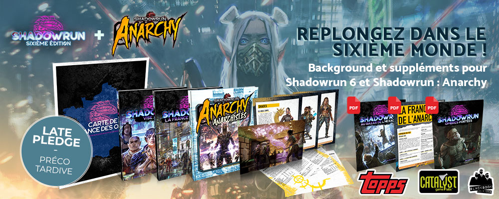 Le late pledge pour les suppléments Shadowrun 6 & Shadowrun Anarchy est désormais disponible ! Au programme : des ouvrages de création française exclusifs et inédits, des nouvelles formes de magie, des nouveaux métavariants et des nouvelles menaces technologiques et magiques pour Anarchy, un supplément entièrement dédié à la France de 2080, un guide complet pour devenir le meilleur runner du Sixième Monde, des aventures, une campagne, des prétirés inédits et de nombreuses surprises !