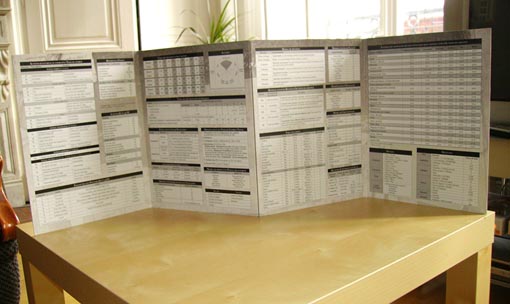 Nous espérons qu'il vous plaira. Un soin particulier a été attaché à l'utilité, à l'organisation des tables du MJ et à la solidité de l'objet (en carton rigide). Voici quelques photos pour vous donner une idée du résultat :