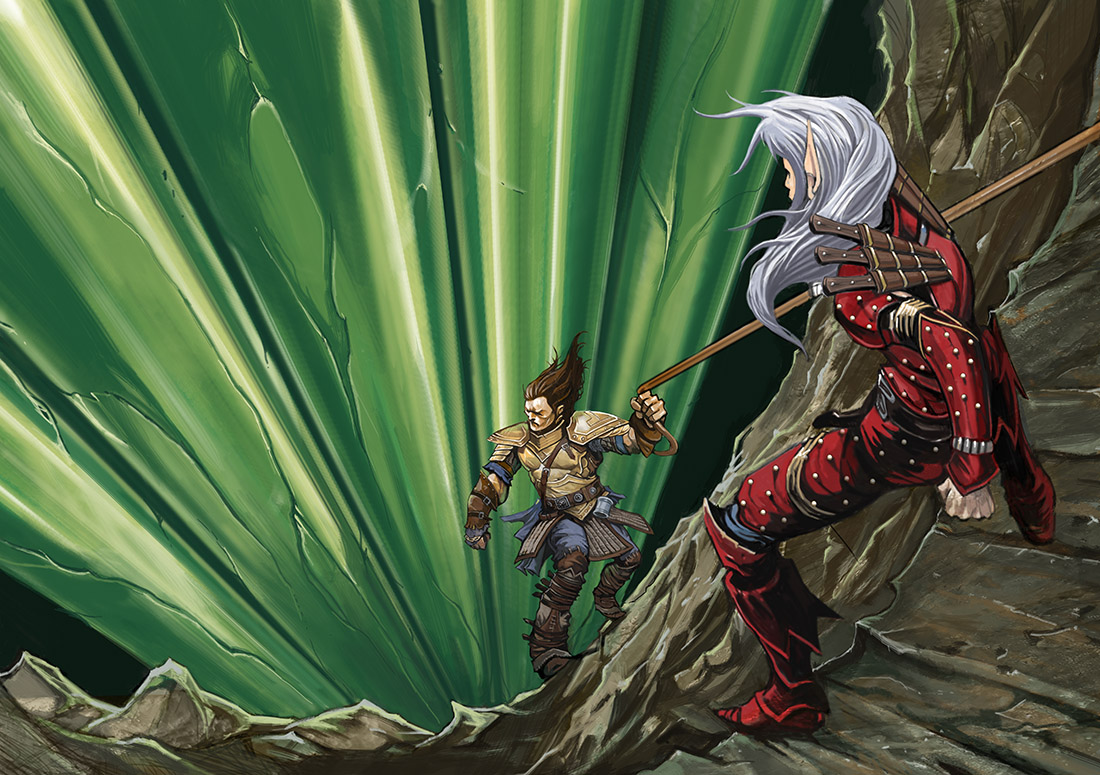 Mais ce qu’il faut surtout retenir de tout cela, c’est que l’ensemble est parfaitement jouable ! En effet, s’il est possible de jouer le module tel quel, Fort Inévitable, la ville voisine de la Tour d’émeraude et bastion des Chevaliers Infernaux ouvre déjà de nombreuses possibilités. Plusieurs PNJ seront à même d’offrir des missions et des récompenses spécifiques aux PJ au fur et à mesure de leur exploration de la Tour d’émeraude, comme autant de quêtes annexes ou de bonnes raisons de retourner dans la Tour. C’est au MJ de décider du moment où les personnages obtiennent ces quêtes, la méthode la plus simple consistant évidemment à les leur livrer dès le début de l’aventure. Mais si vous souhaitez prendre le temps de planter le décor et le background des lieux, vous leur proposerez par exemple la quête Des amis dans le fort lors de leur première visite au fort Inévitable ou quand ils découvriront la présence des Chevaliers infernaux et des Sept renards. De la même façon, ils peuvent obtenir la quête des Donjons de la Colonne juste après avoir appris qu’une strate s’étend sous la structure visible de la surface.