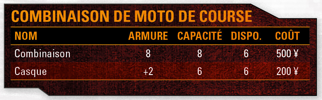 Je vais vous dire ce que c’est : le chic version gang de motards. On en trouve dans tout un choix de couleurs personnalisables, avec ou sans logo de marque de moto et slogan d’équipe de combat de moto. C’est l’une des armures les plus évidentes que l’on puisse trouver, mais elle semblera parfaitement normale pour quiconque qui vous aurait entendu ou vu arriver à moto. Les gens vont remarquer que vous la portez, mais ne vont pas automatiquement comprendre que vous préparez quelque chose.