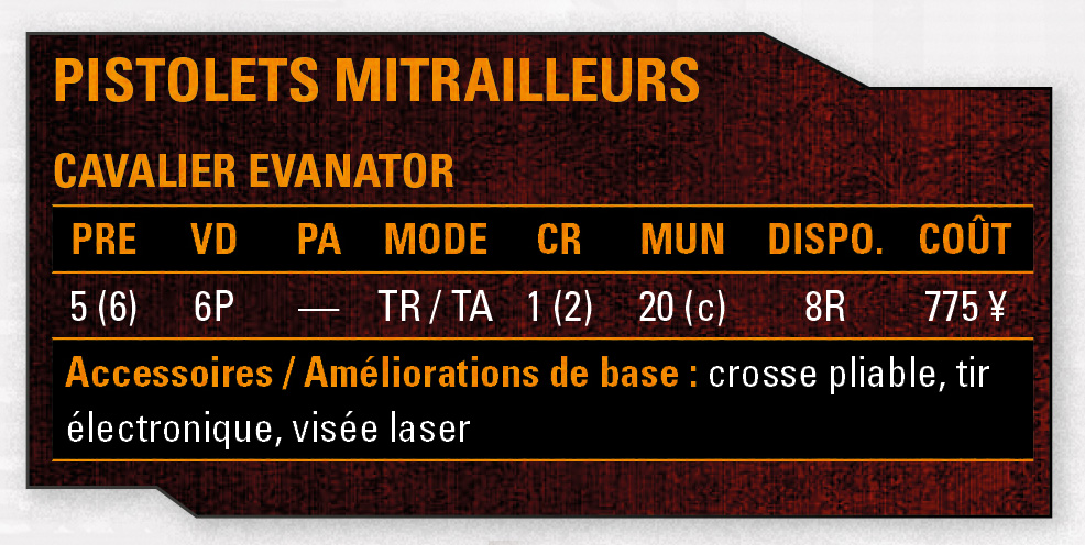 Run & Gun comporte un véritable arsenal. Mais, fidèle à l’ambiance des premières heures de Shadowrun (le fameux Catalogue du samouraï des rues !), ce n’est pas une simple liste de modèles et de statistiques qui vous est proposée. En effet, de nombreuses illustrations et surtout des anecdotes et avis divergents de shadowrunners enrichissent ce catalogue pour le rendre assez unique dans le genre. Voici quelques exemples pour cette première preview :