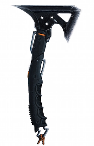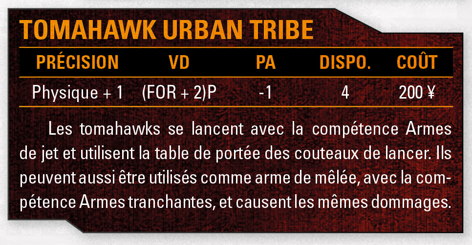 On ne parle pas du tomahawk de votre grand-père. Faite de matériaux composites actuels et équilibrée pour le lancer, cette version moderne de l’arme amérindienne classique respecte autant que possible ses prédécesseurs tout en les faisant entrer dans le XXIe siècle. Populaire auprès des gangs tribaux, en particulier les First Nations à Seattle, ces outils de mort finement assemblés se retrouvent aussi à la ceinture des Rangers Salish et Wildcats Sioux.