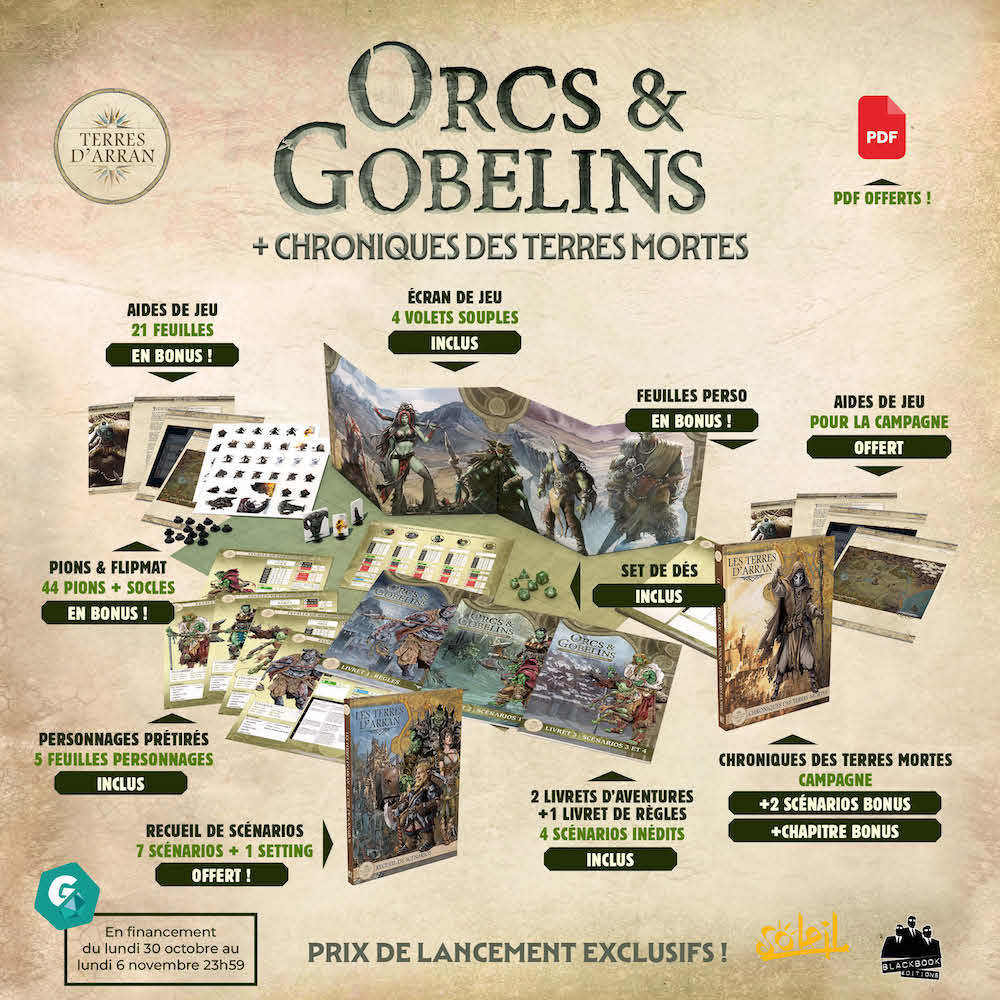 La nouvelle boîte d'initiation Orcs & Gobelin, contenant des scénarios inédits et de nombreux cadeaux, ainsi qu'un nouvel ouvrage de campagne Chroniques des terres mortes sont disponibles en précommande jusqu'à ce soir 23h59 !