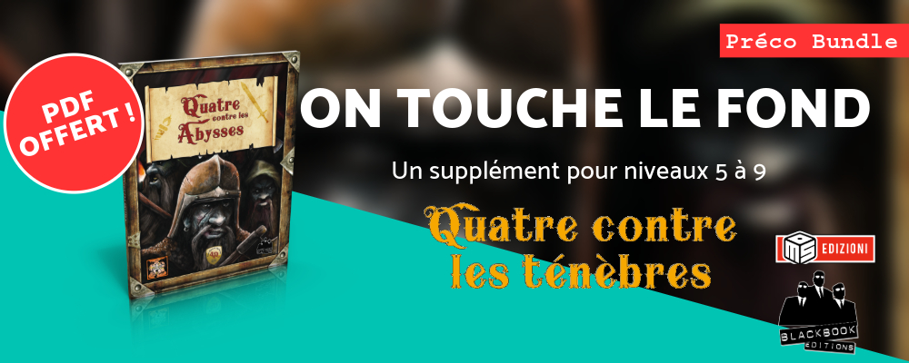 Nous sommes très heureux de vous annoncer le lancement des Précos Bundle (version numérique offerte mise à dispo immédiatement) du prochain supplément pour Quatre contre les ténèbres, qui s'intitulera Quatre contre les abysses - tout un programme pour ce supplément conçu pour des personnages de niveaux 5 à 9 !