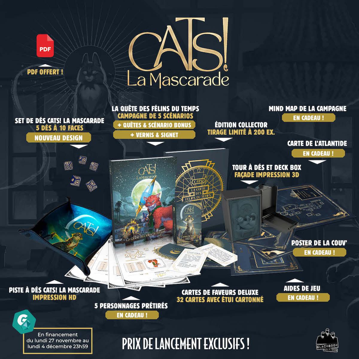 La précommande pour l'ouvrage de campagne la Quête des félins du temps est disponible sur Game On Tabletop et se termine ce soir à 23h59. Elle vous offre l'opportunité de profiter de prix de lancement exclusifs (ouvrages moins chers qu'en boutique), d'accéder en avant-première aux précommandes de la version collector, de saisir les nombreux cadeaux débloquer, de profiter des améliorations de produits et de découvrir des goodies et du matériel de jeu inédit Cats! La Mascarade.