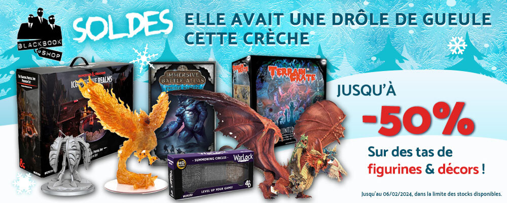 Les soldes d'hiver 2024 sont particulièrement riches en figurines et décors cette année. Petit florilège : Le phoenix élémentaire et ses congénères de la collection Icons of the Realms, comme la Gargantuan Tiamat qui nous a fait halluciner, mais aussi les figurines à peindre de Nolzur's Marvelous Unpainted Miniatures. Que vous ne manquerez pas de présenter à vos joueurs dans des environnements extraordinaires : la mythique Auberge du Yawning Portal ou la Tour, classique mais efficace !