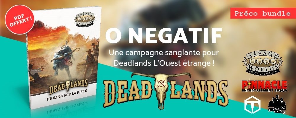 Derniers jours donc pour profiter des Précos Bundle (version numérique offerte mise à dispo immédiatement) pour la campagne Du sang sur la piste pour Deadlands L'Ouest étrange motorisé par Savage Worlds Adventure Edition ! À partir de ce vendredi à 9h, versions papier & PDF seront vendues séparément.