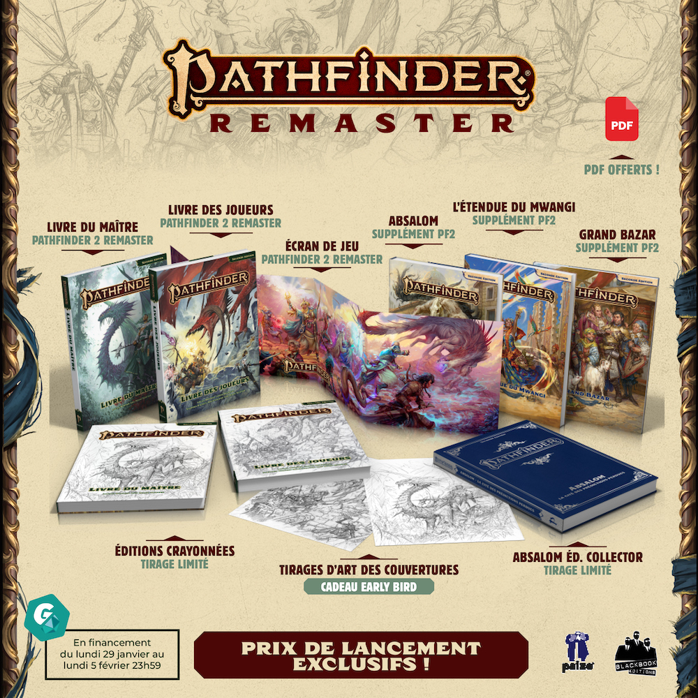 Et pour en savoir plus sur tous les nouveaux ouvrages de Pathfinder, les suppléments de lore et les changements de cette version remaster, on vous donne rendez-vous à 19h sur la chaîne YouTube de Black Book Éditions pour le LIVE DE LANCEMENT en compagnie de Tony & Steve !