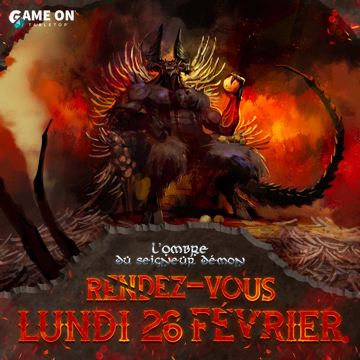 Le Seigneur Démon vous donne rendez-vous pour le début de la fin sur Game On Tabletop le 26 février 2024 à 18h45, il y sera question de magie noire, de créatures des ténèbres, de sang, de viscères, de crocs acérés et de damnation éternelle !