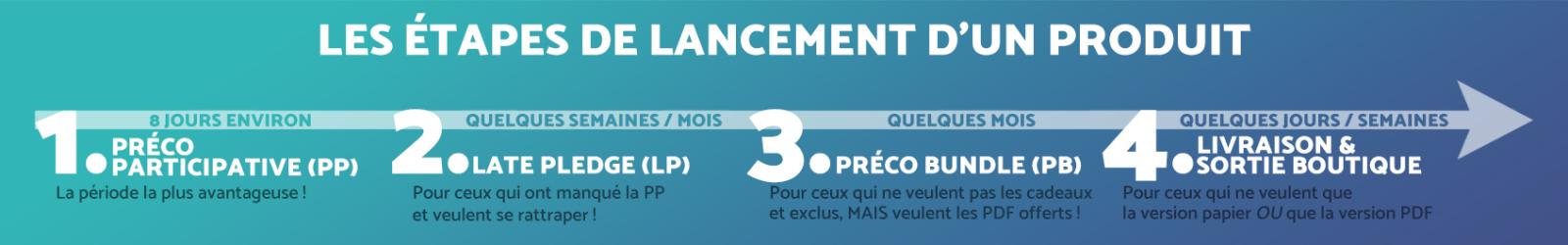 Nos projets les plus importants (nouvelles gammes, produits majeurs, suppléments et campagnes particulièrement importants) sont lancés sous forme de précommande participative ("PP") sur la plateforme Game On Tabletop. Généralement, nous en menons une par mois soit 11 par an (eh oui en août la moitié de la France est en vacances, et pas mal d'entre nous aussi !), avec des lancements le dernier lundi (plus rarement le premier lundi) de chaque mois, pour une durée de 8 jours généralement. En fonction du volume de précommande (nombre de souscripteurs et montants levés), des paliers peuvent être franchis qui permettent d'améliorer les produits, de débloquer des produits supplémentaires, des options, des cadeaux... les versions numériques des ouvrages sont offertes pour toute participation et précommande des versions papier. Sauf mention contraire, comptez généralement 12 mois en moyenne pour la livraison d'un projet de ce type.