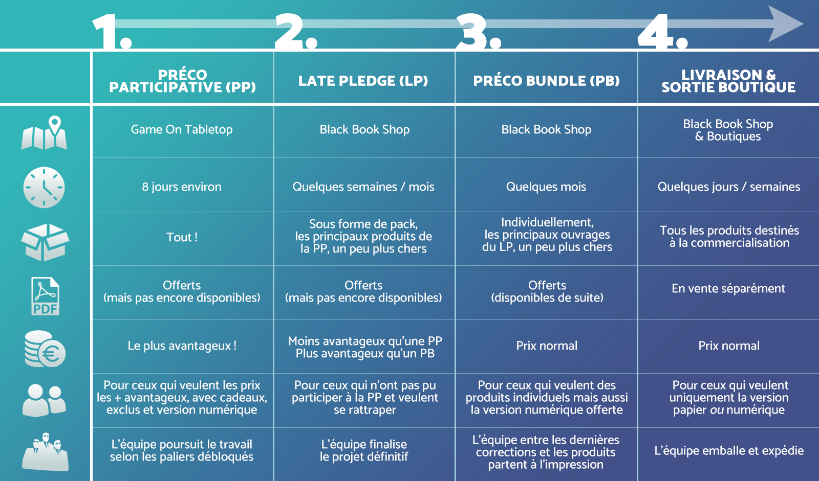 Vous avez loupé une PP sur Game On Tabletop ? Pas d'inquiétude, vous pouvez dès les jours suivants sauter sur le late pledge ("LP" ou préco tardive), disponible directement sur la boutique du site Black Book Editions pendant quelques semaines, voire quelques mois.